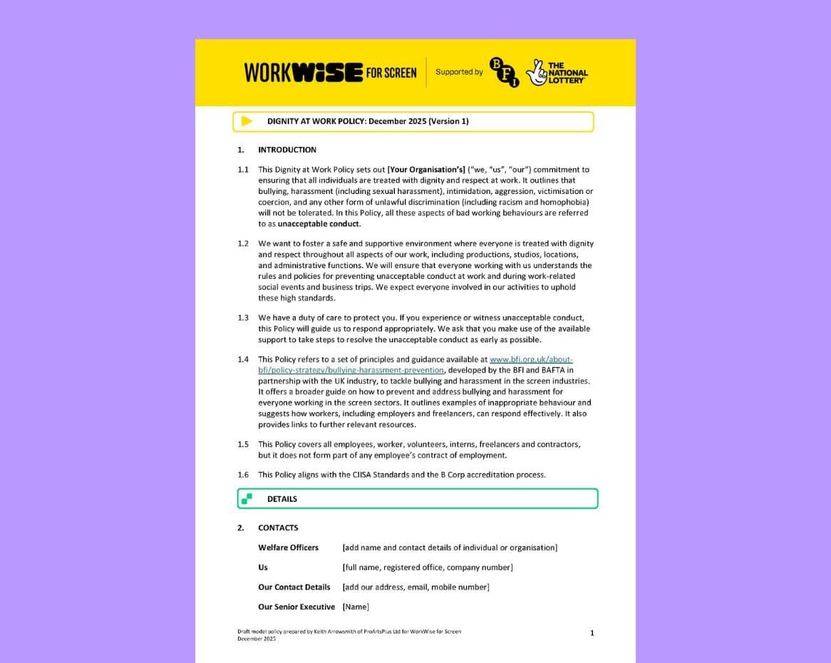 This policy is based on the BFI’s Dignity at Work Policy template. We have ensured it reflects best practice and sector standards across the screen industries. It’s intended to be used as a practical guide for understanding the Workwise approach to dignity and respect at work, helping everyone interpret what this looks like in practice. The policy sets out how your screen business will aim to create a safe, supportive and respectful working environment and highlights relevant support and resources.