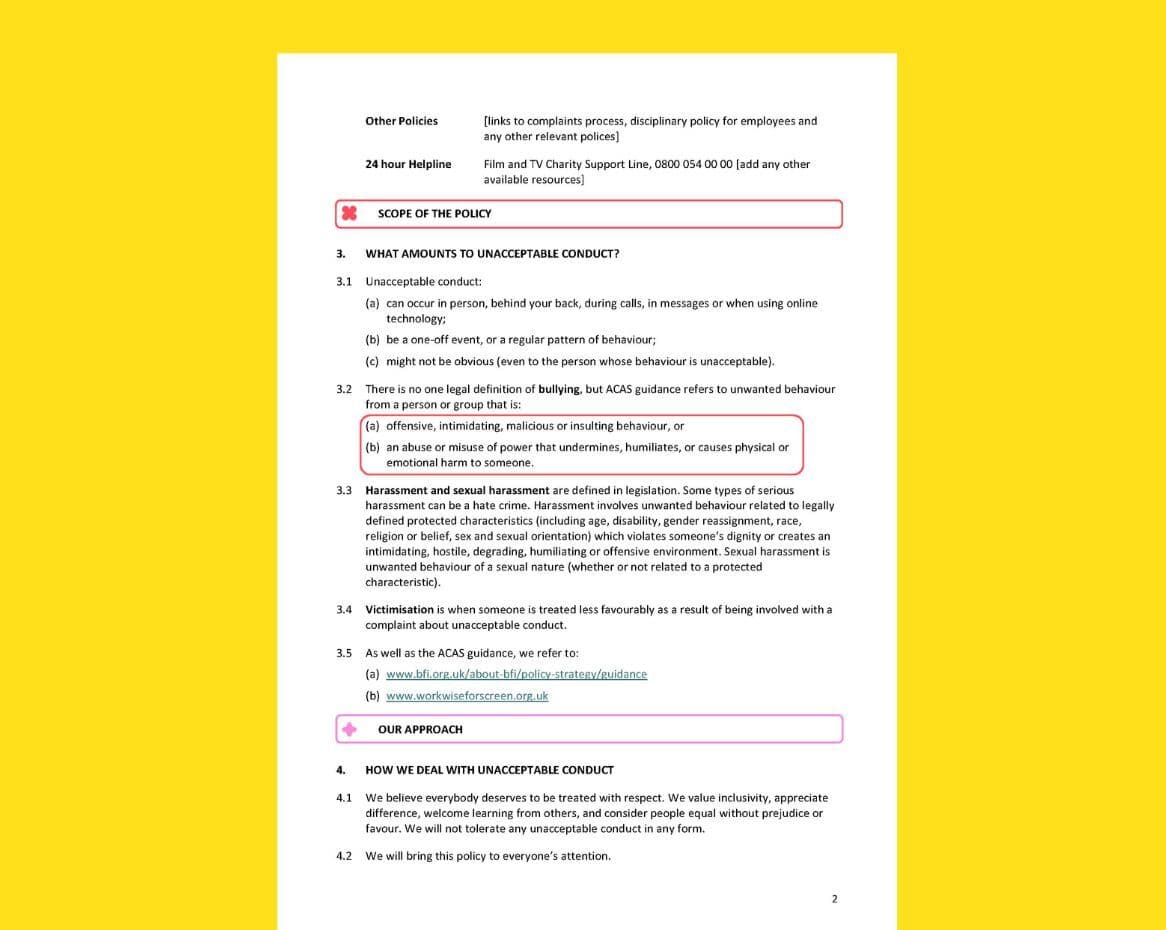 This policy applies to all working relationships in the screen industries, including employees, workers, freelancers, contractors, trainees, volunteers and anyone else engaged in work-related activities. It covers behaviour in the workplace, during work-related social events, business travel, online communications and any situation connected to your business.