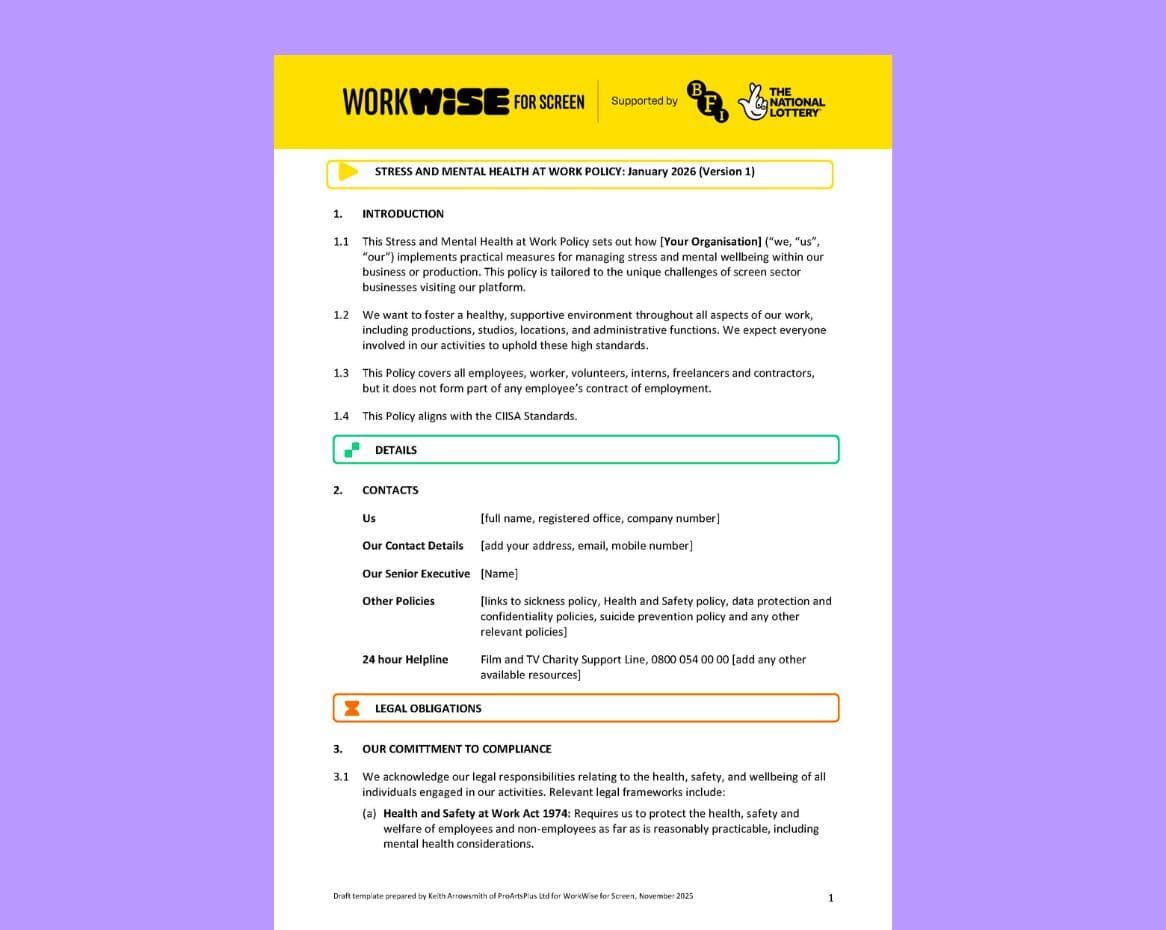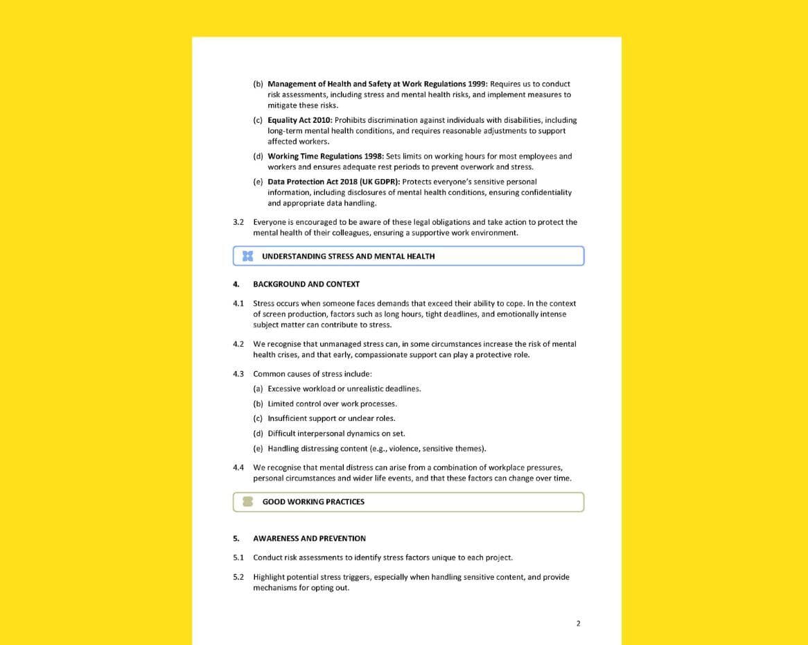 This model policy outlines practical measures for recognising, preventing, and managing work-related stress and supporting mental wellbeing. It is designed to reflect the unique working patterns, pressures, and project-based nature of screen sector businesses. A high-level Health and Safety policy may be sufficient to address these requirements; however, this policy should be used where more detailed guidance is required by your business.