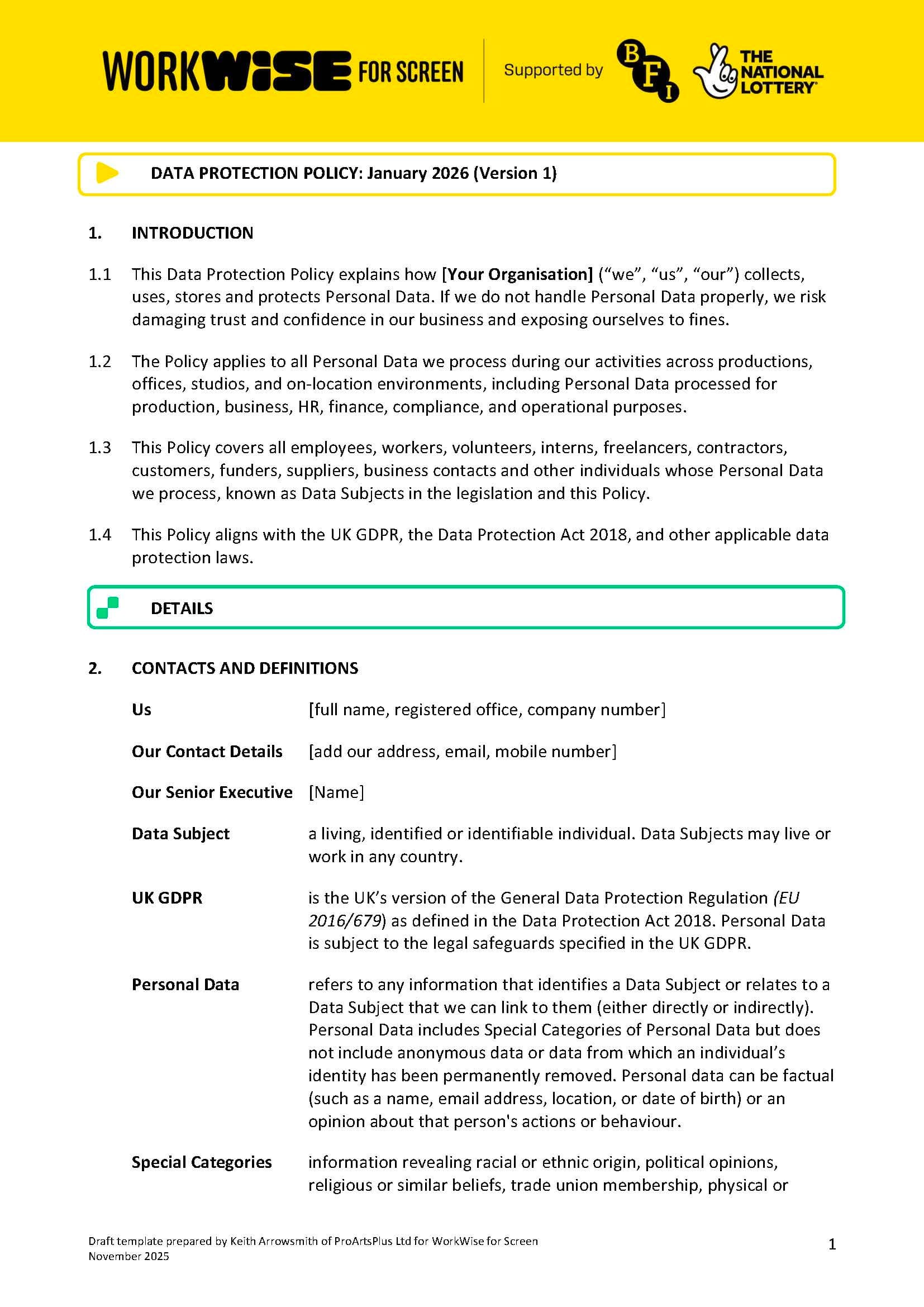 This policy explains how businesses in the screen industries collect, use, store and protect personal data. It sets out clear expectations about how personal data should be handled and what to do if something goes wrong.