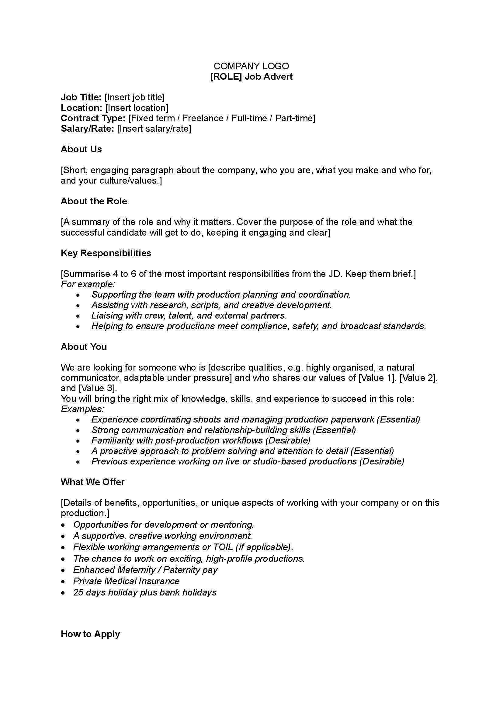 Not sure how to write a job advert? Perhaps start with this Guidance For Writing a Job Advert to find out top tips for attracting the right candidates. If you've already read this guidance, check on the template below or hit the download button to use later.